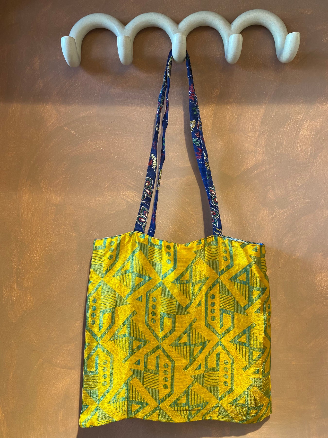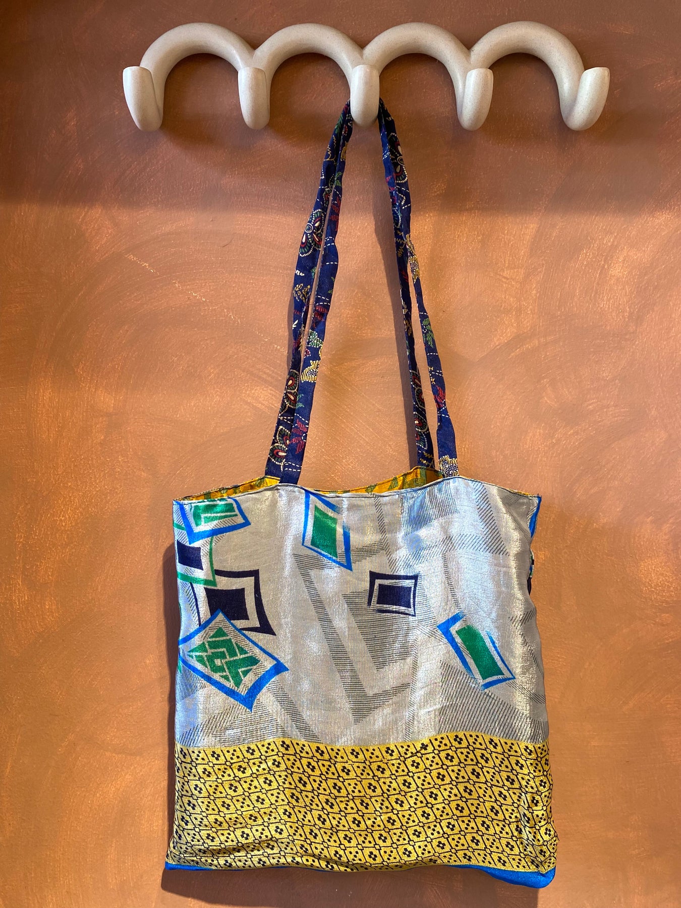 Our reversible silk bag are made with colorful patterns in 100 % silk. Each piece is unique and handcrafted with recycled silks.