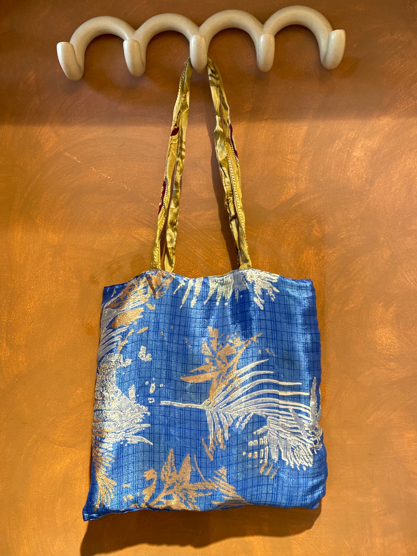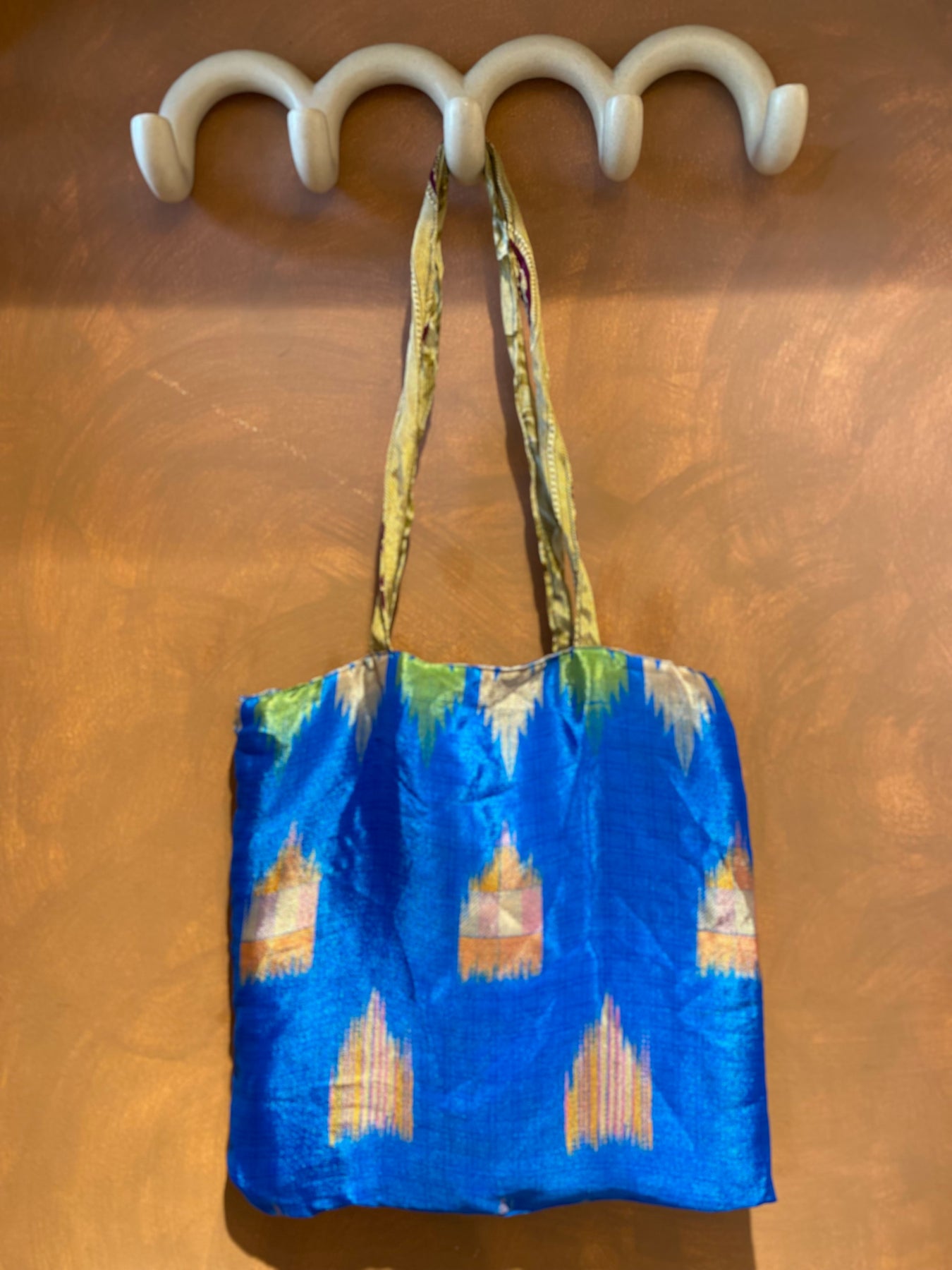 Our reversible silk bag are made with colorful patterns in 100 % silk. Each piece is unique and handcrafted with recycled silks.
