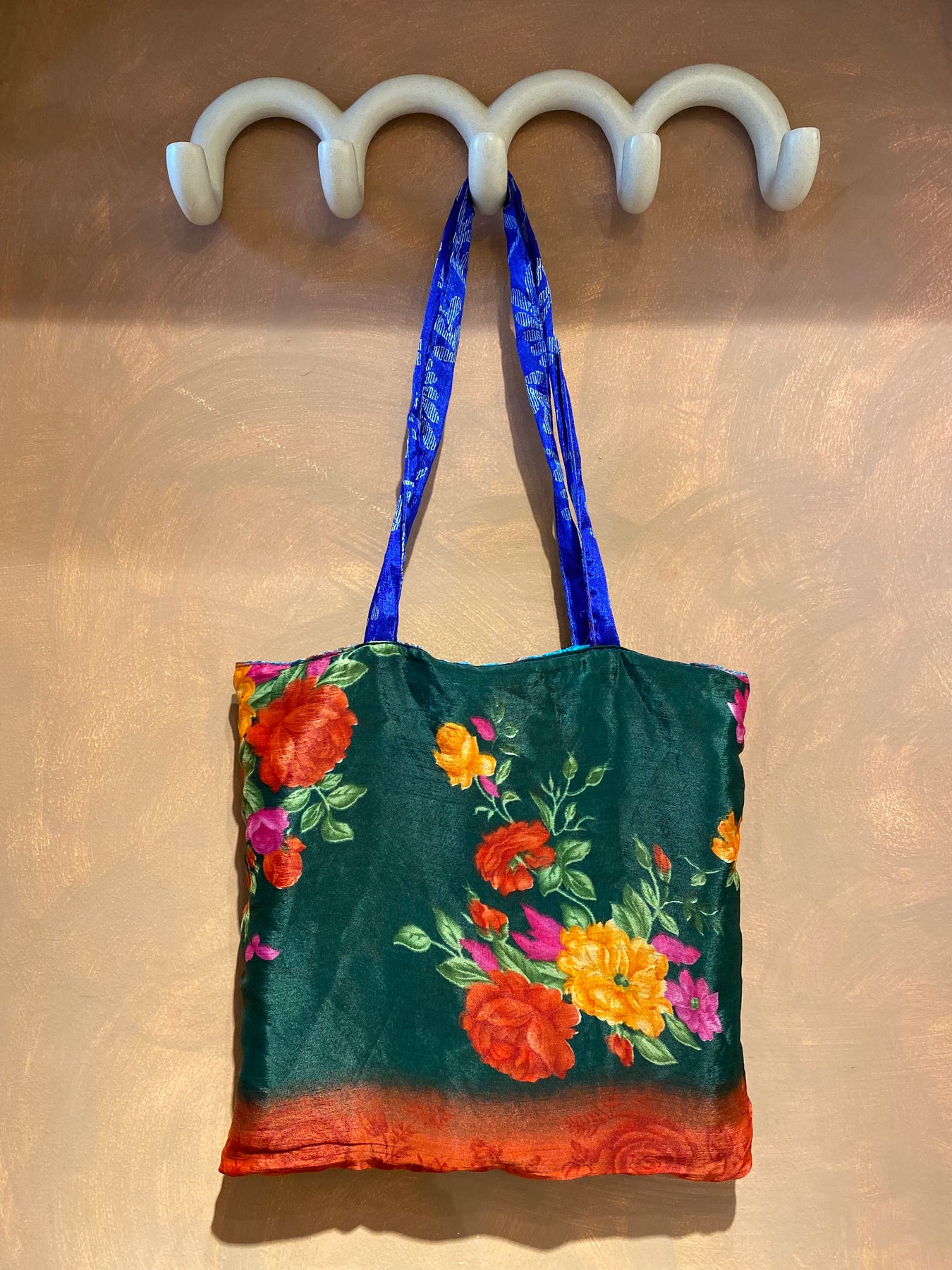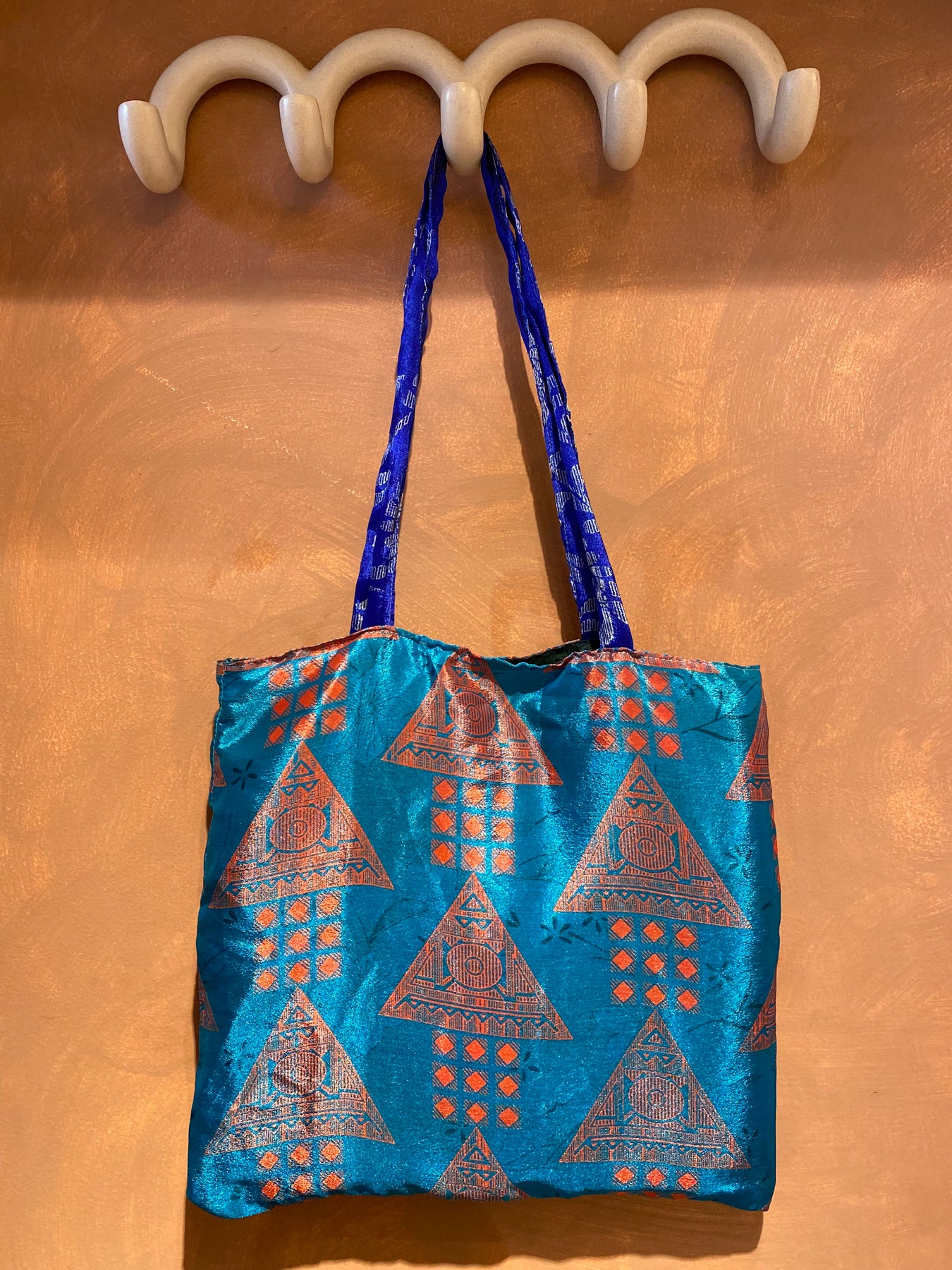 Our reversible silk bag are made with colorful patterns in 100 % silk. Each piece is unique and handcrafted with recycled silks.