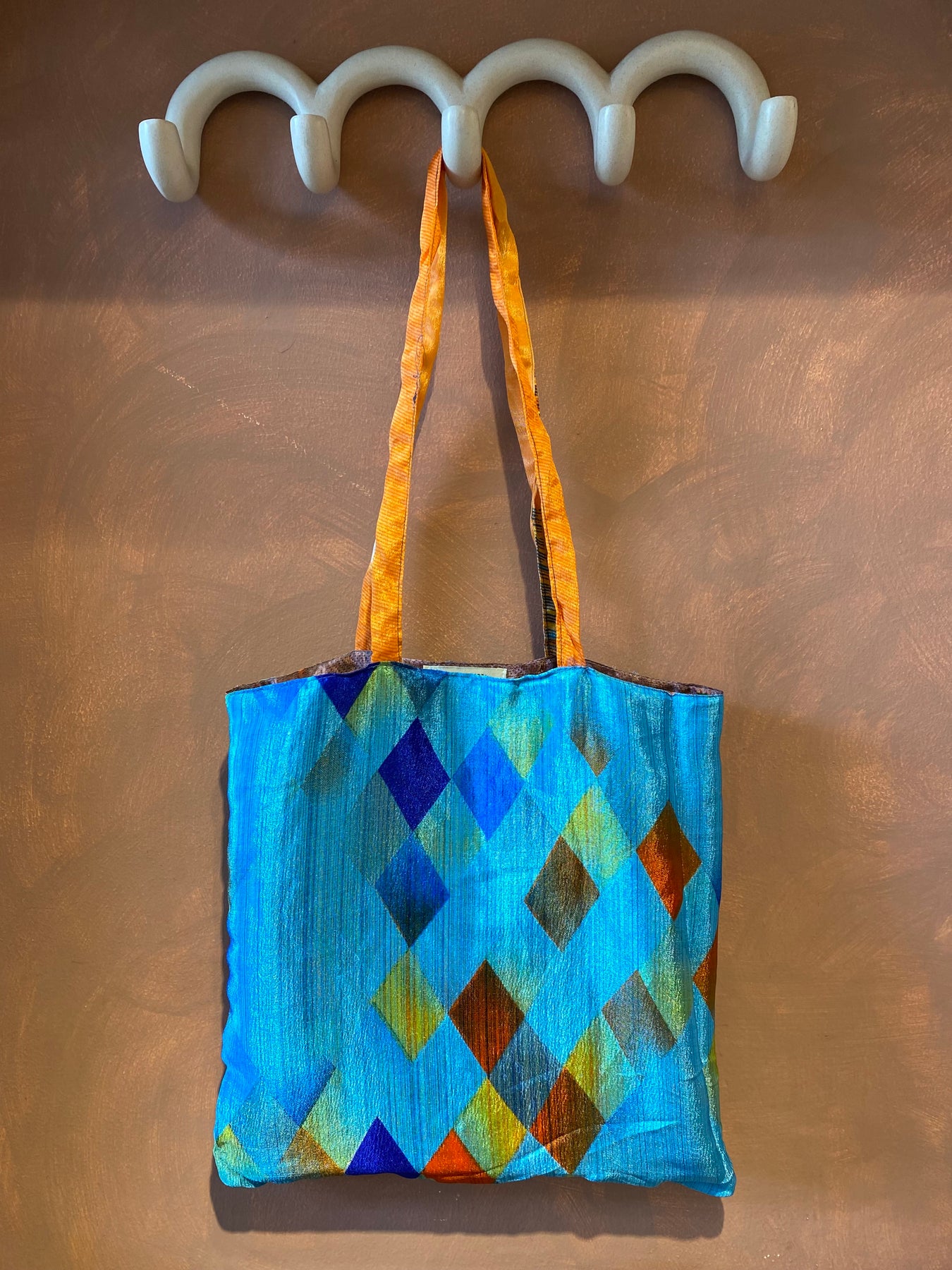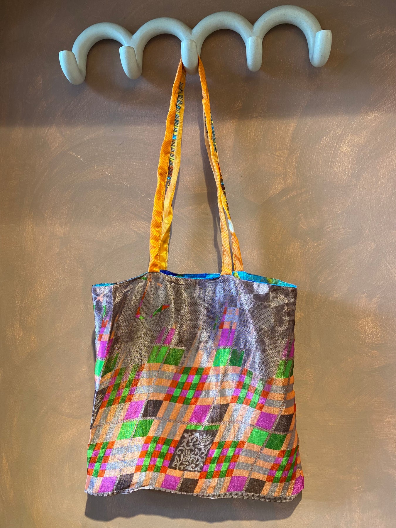 Our reversible silk bag are made with colorful patterns in 100 % silk. Each piece is unique and handcrafted with recycled silks.