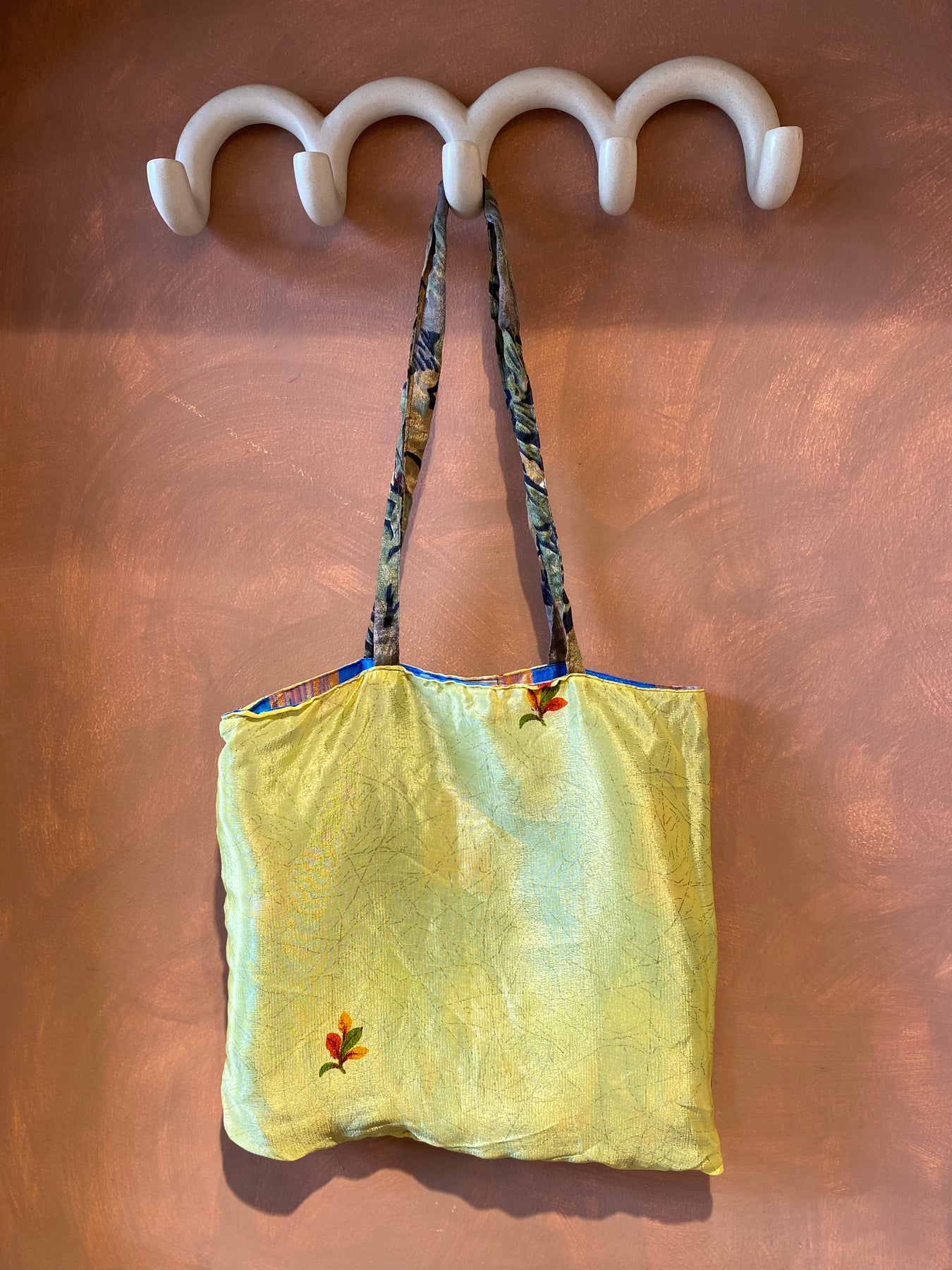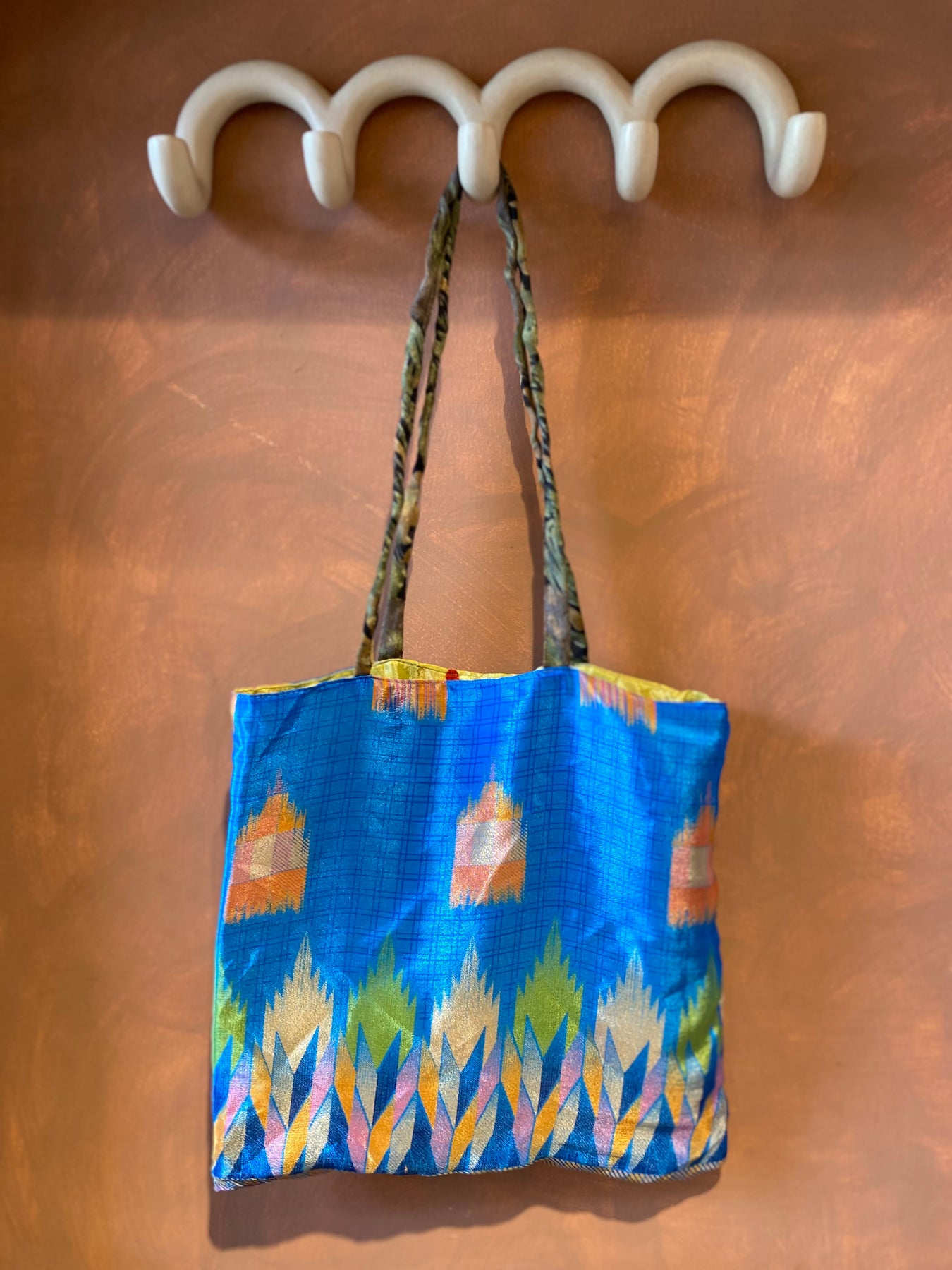 Our reversible silk bag are made with colorful patterns in 100 % silk. Each piece is unique and handcrafted with recycled silks.
