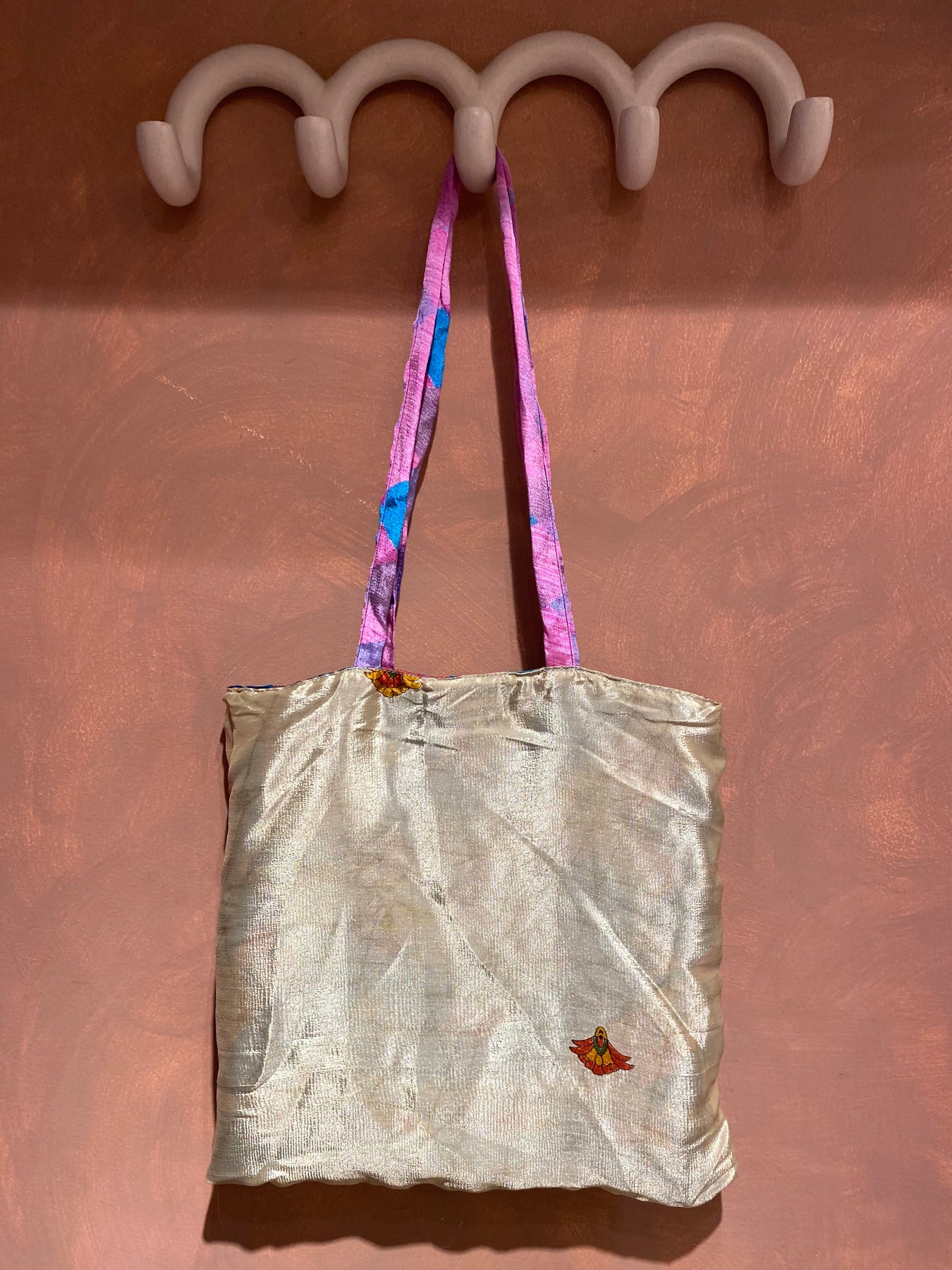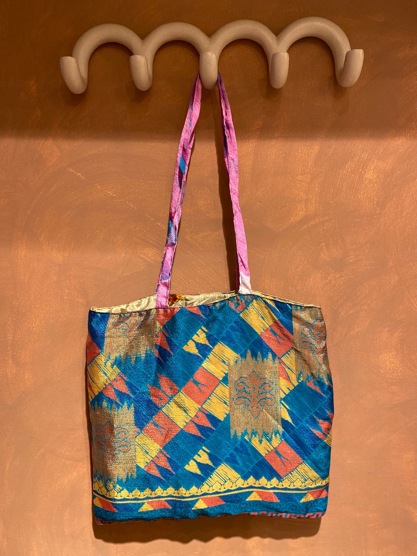 Our reversible silk bag are made with colorful patterns in 100 % silk. Each piece is unique and handcrafted with recycled silks.