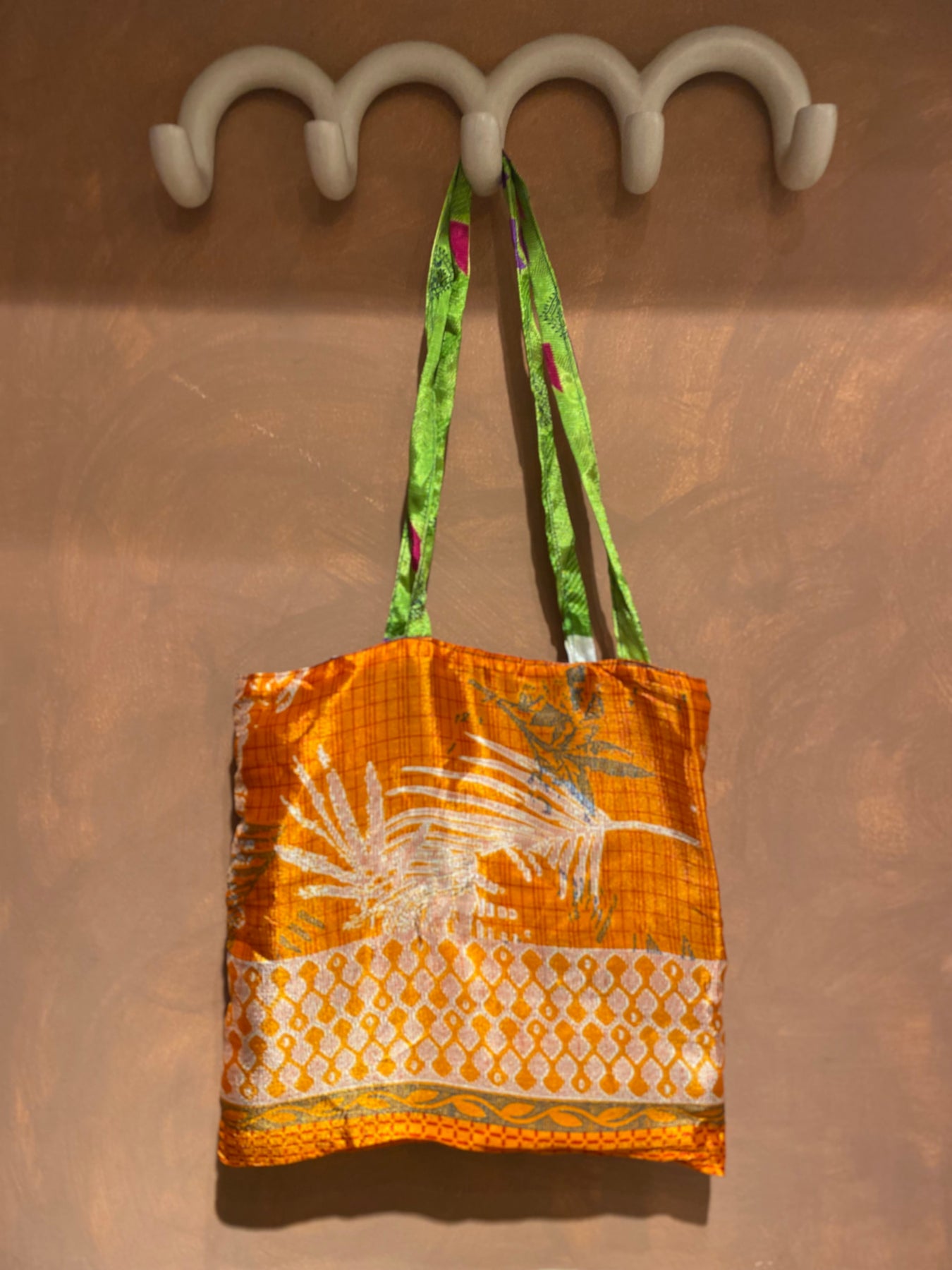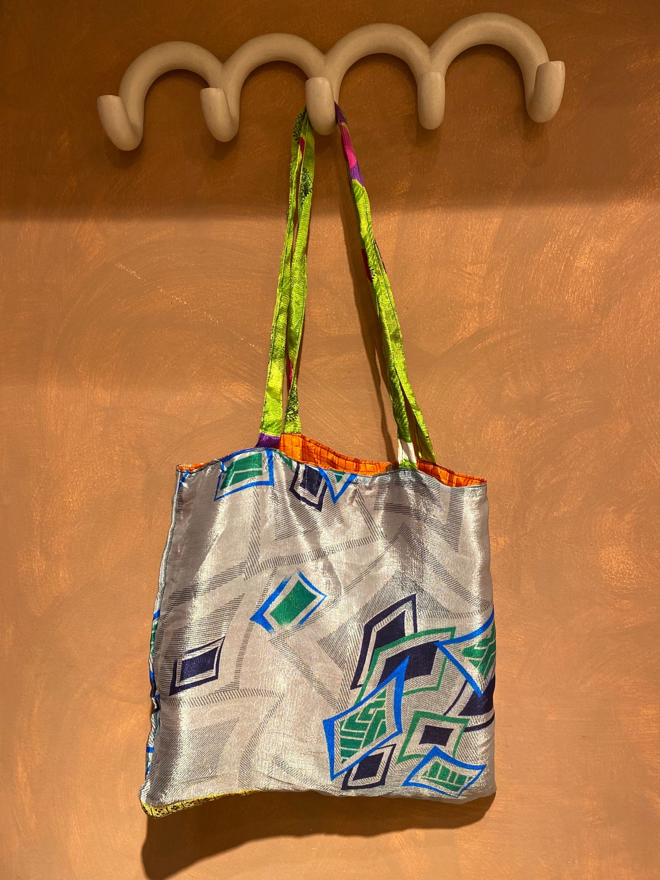 Our reversible silk bag are made with colorful patterns in 100 % silk. Each piece is unique and handcrafted with recycled silks.