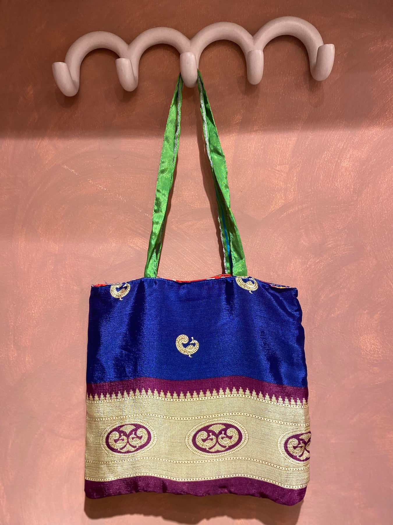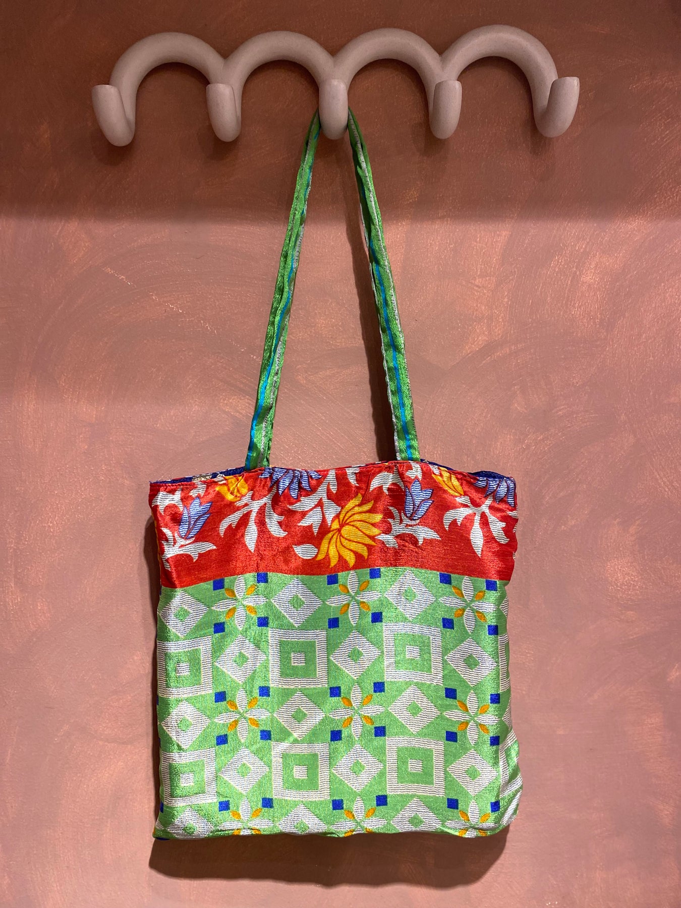 Our reversible silk bag are made with colorful patterns in 100 % silk. Each piece is unique and handcrafted with recycled silks.